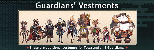 Towa, priestess of Shinju, stands united with 8 trustworthy companions to defeat Magatsu. Fight alongside a fellow guardian and wield the power of the sacred sword (Tsurugi) and staff (Kagura). Each guardian has its own abilities and set of swords, making each combat style and guardian pair unique. Together, pave your way through colorful lands, conquer dungeons, and defeat Magatsu’s minions!